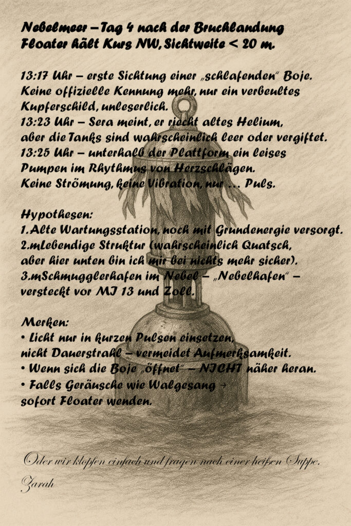 13:17 Uhr – erste Sichtung einer „schlafenden“ Boje. Keine offizielle Kennung mehr, nur ein verbeultes Kupferschild, unleserlich.
