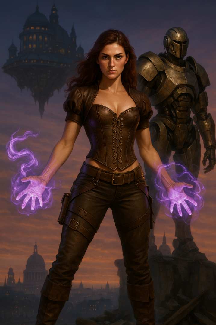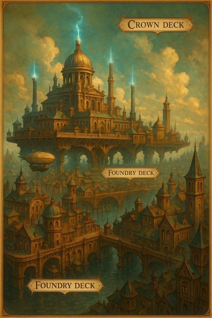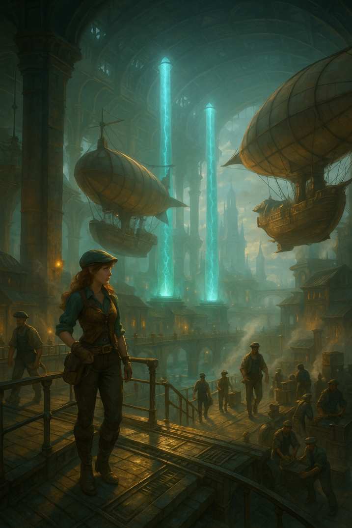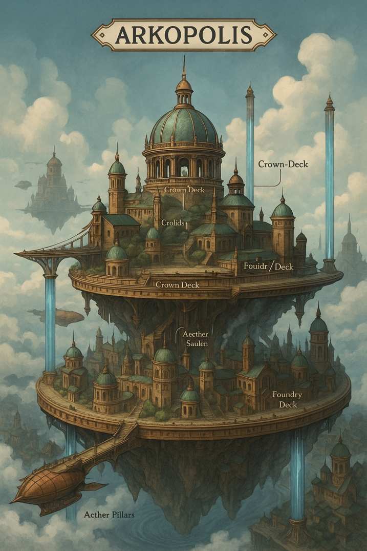 Arkopolis ist eine schwebende Stadt über dem viktorianischen London: voller Sky-Docks, Krantrassen, Maschinenhallen, Foundry-Hinterhöfe und verborgener Zugänge. Zwischen Ruß, Aethertechnik und den strengen Regeln des Hermetic College prallen Alltag, Magie und soziale Härte direkt aufeinander. Doch hinter den Docks endet die Welt nicht. Mit Kamien, den Häusern Vyreth und Orcal und dem Crown-Seed öffnet sich ein viel größerer Horizont, der weit über die Erde hinausreicht.