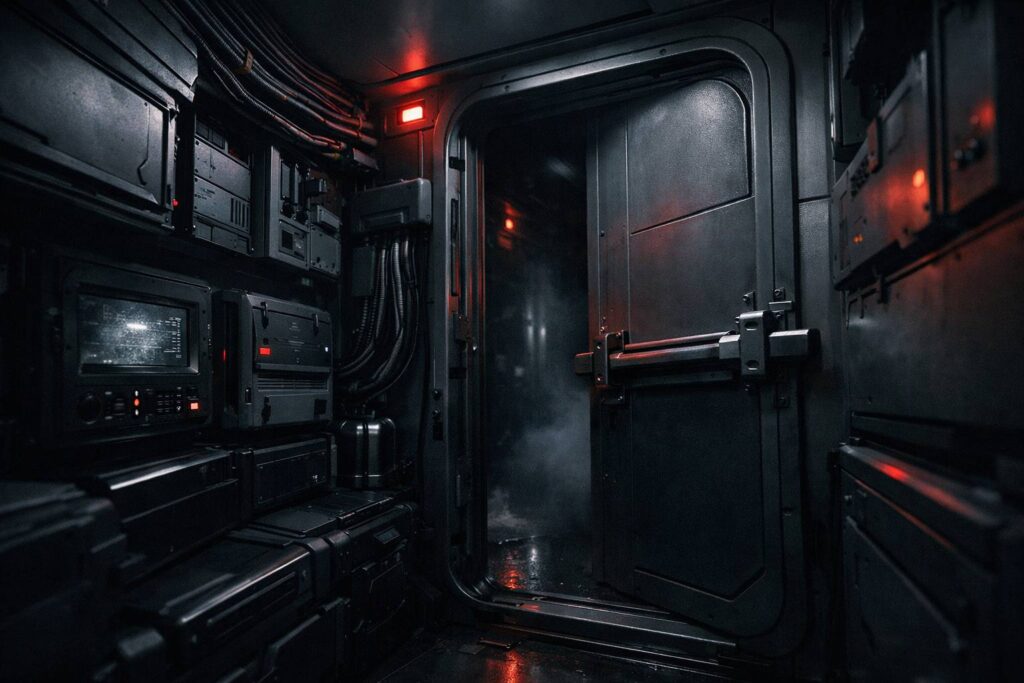 Wir treten ein. Ich drรผcke die Tรผr zu, ziehe den Riegel vor. Das Klicken des Mechanismus ist das erste Gerรคusch seit Minuten, das nicht nach Gefahr klingt.